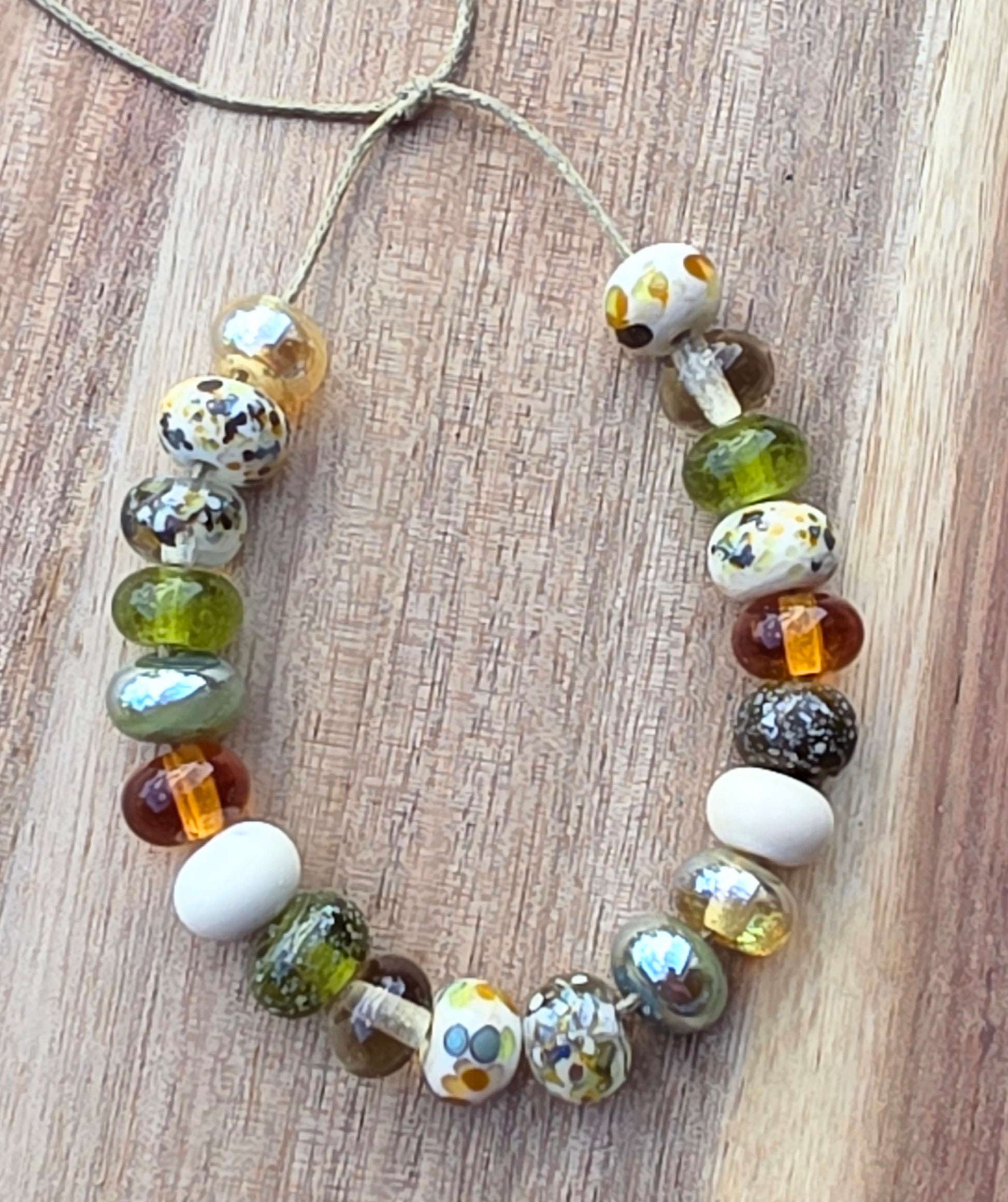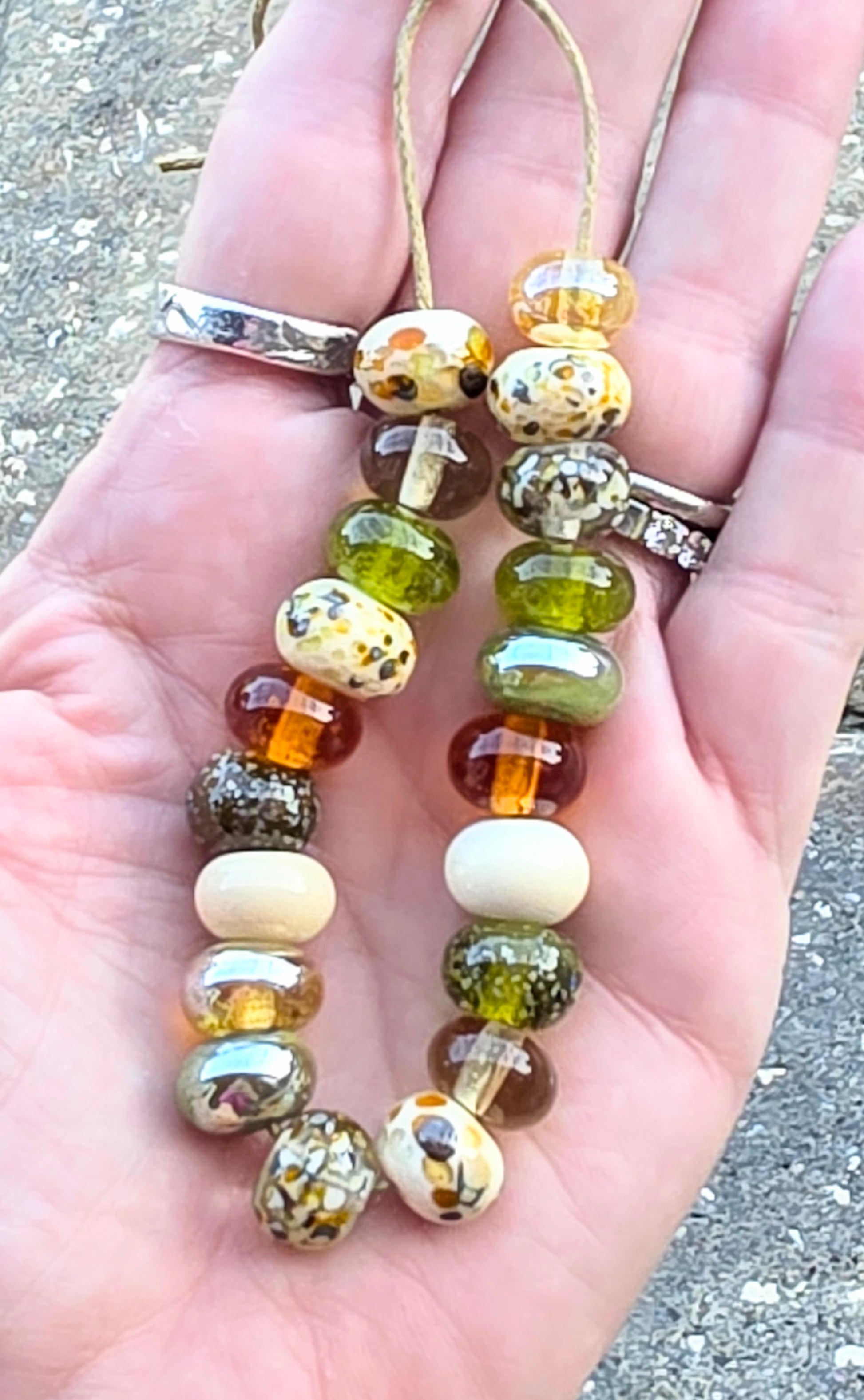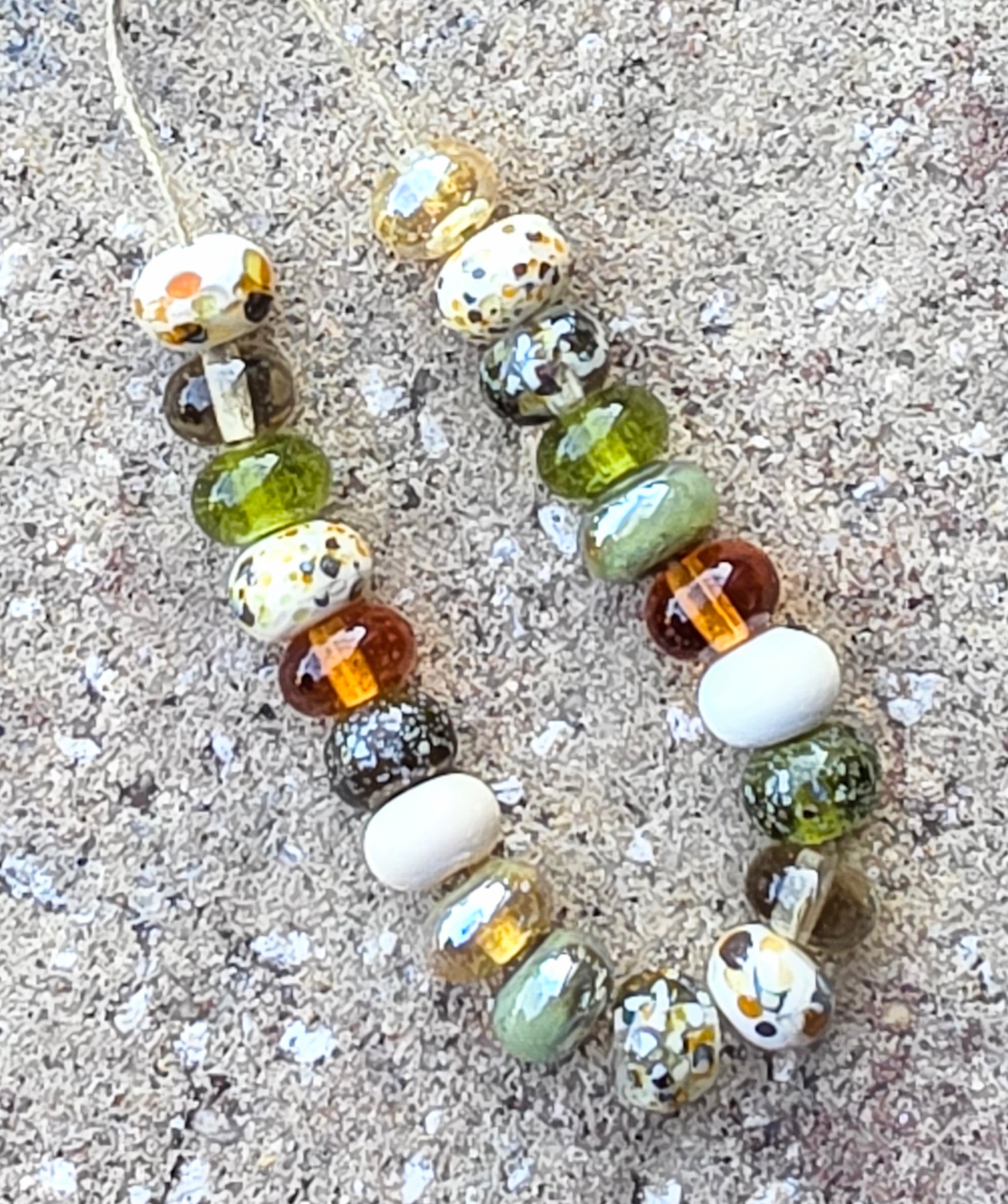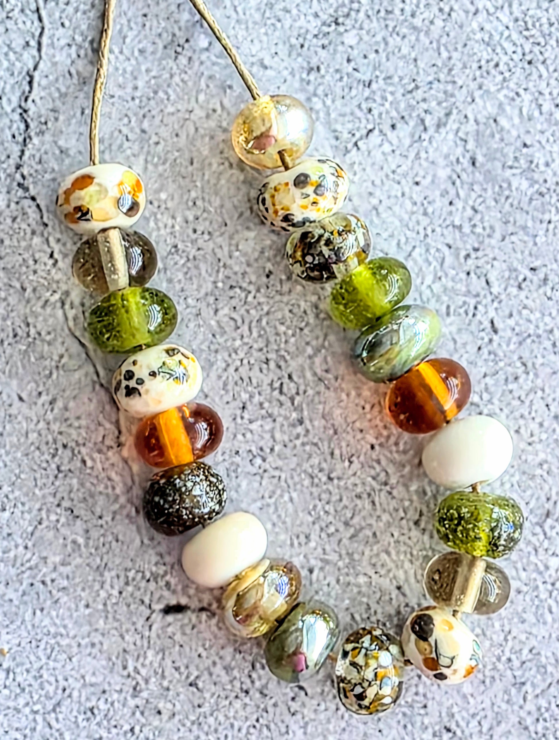 Handmade glass beads inspired by the colors of a golden autumn afternoon — mossy greens, honey amber, creamy ivory, and soft silver tones that shimmer like sunlight through falling leaves. Each bead is individually lampworked in the flame, creating its own organic patterns and textures.