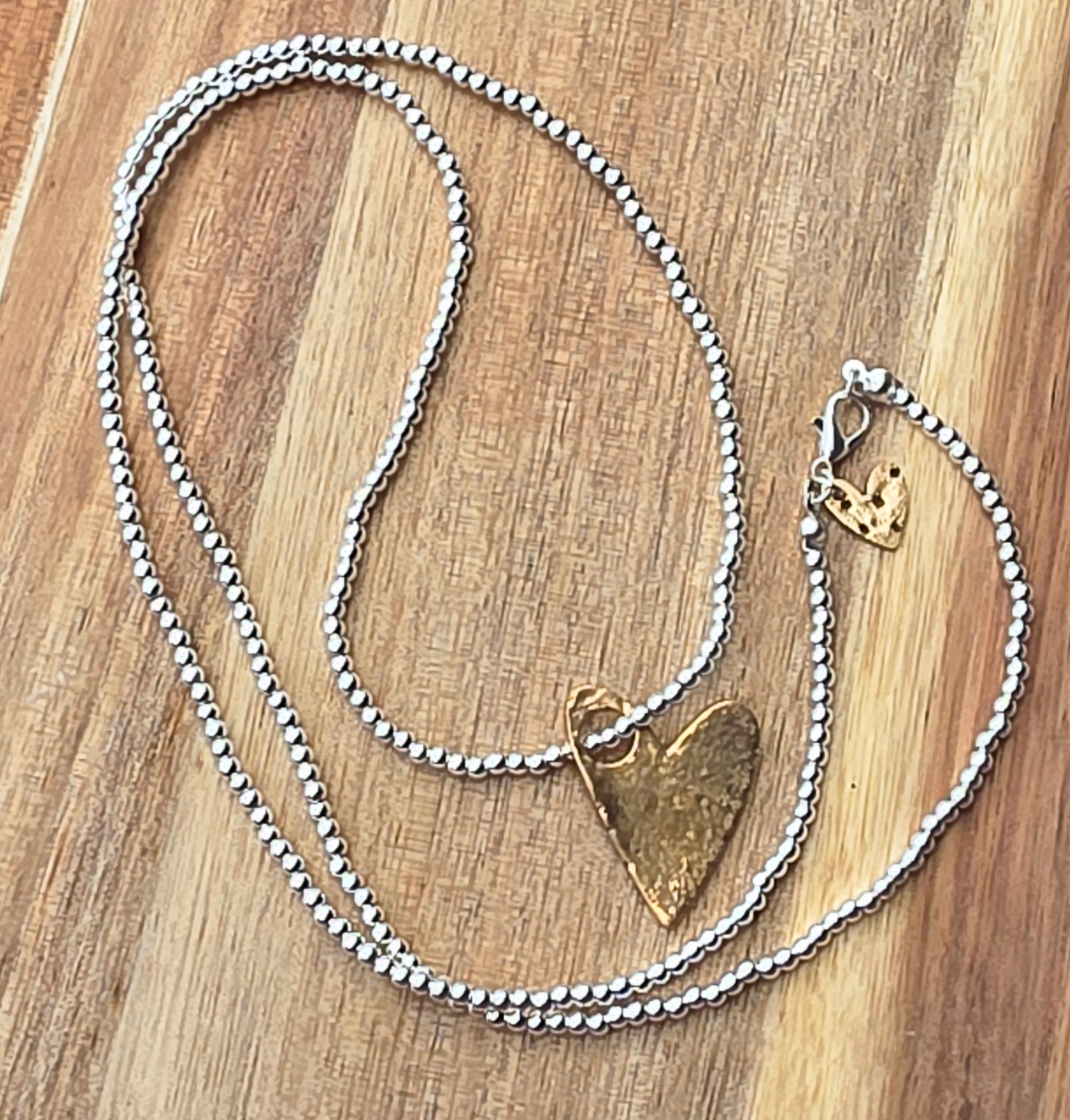 This piece is 30" of silver beads and I hand made the big and little hearts out of bronze. This is so cute with a plain white tee!