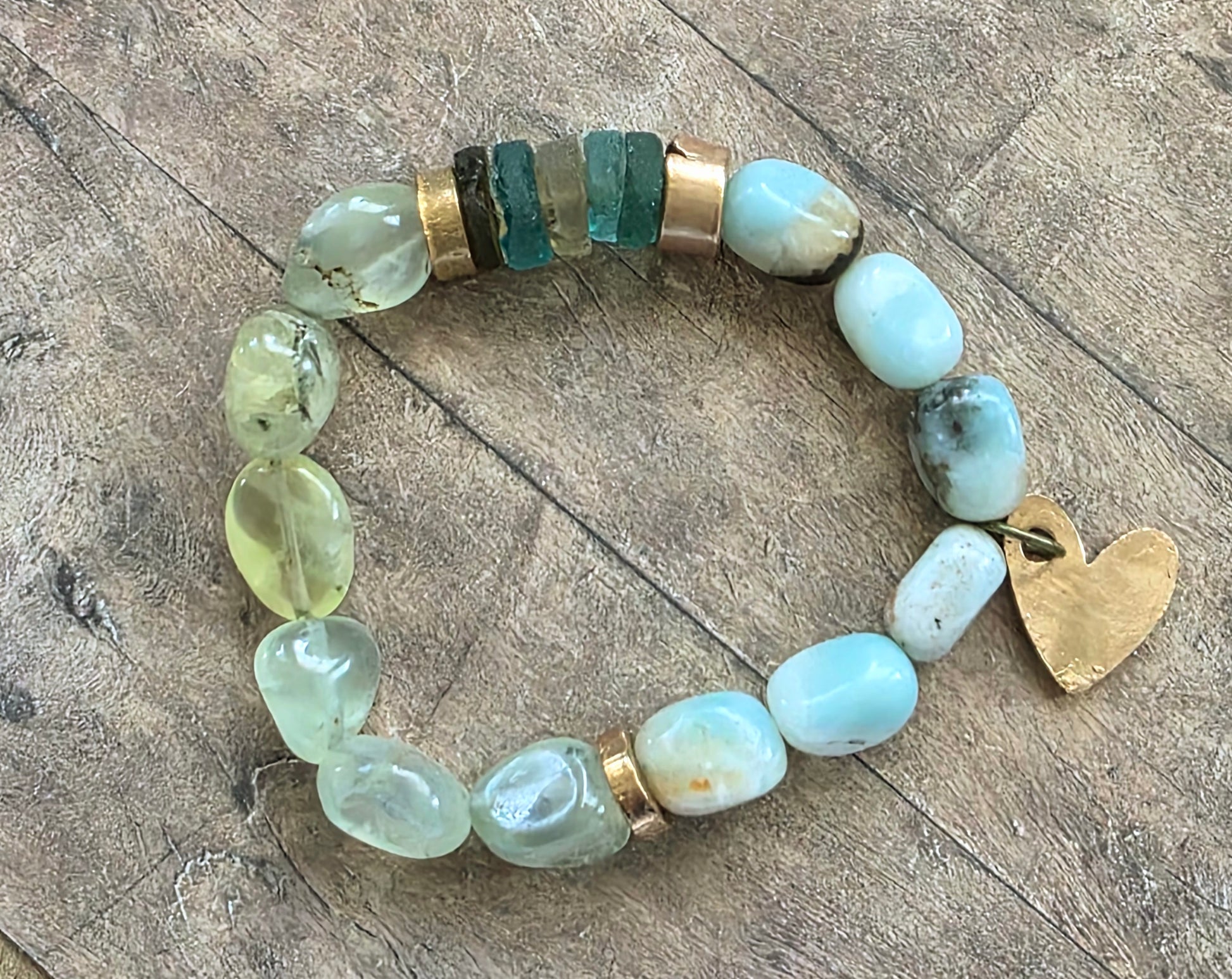 This handmade stretch bracelet features a grounding mix of amazonite, prehnite, and authentic Roman glass, finished with warm hand-cast bronze accents and a small bronze heart charm. Each bead is naturally irregular, giving the bracelet an organic, worn-in look.