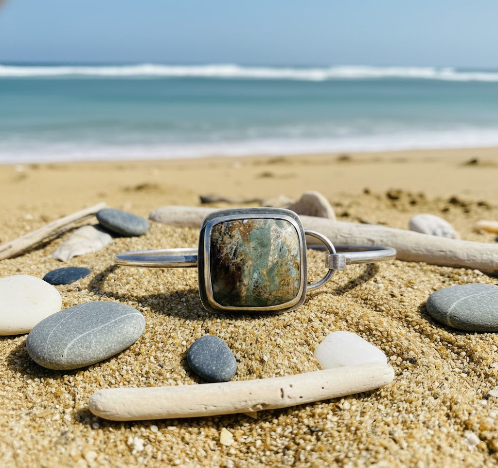 This bangle is perfect for the jewelry collector who values unique, ethically-sourced materials and artisanal quality. The stone itself features a captivating blend of deep mossy greens, rust-colored veins, and soft blues, making it a powerful expression of nature-inspired, bohemian style jewelry. This is a versatile piece, designed for both everyday wear and special occasions.