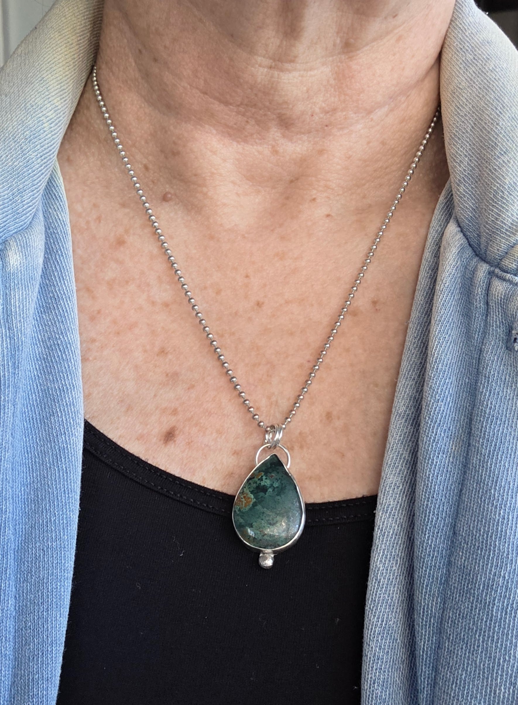 I had not even hear of Morning Dew Jasper until about 2 months ago, then I saw some for sale and I had to get some! I am really liking this stone- I had several pieces sitting on my desk for a while and the energy coming off was so peaceful! I set this in sterling silver and it will come with an 18" gunmetal silver chain.