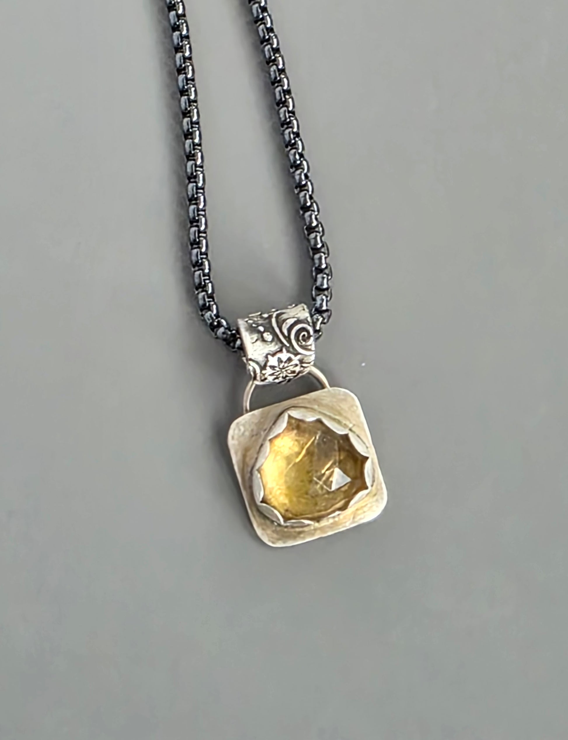 This piece really shines!! It is a beautiful Citrine gemstone that is so clear a vibrant! Set in sterling silver and I handmade the sterling bail as well. It comes with an 18" gunmetal chain.